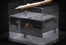 Some fine tuning of the water level and/or the number of magnets under the dish may be required to counteract any remaining influence of the tippet. I use a plastic pipette to add or remove small volumes of water and a paintbrush to steer the fly into a position where it sits still.