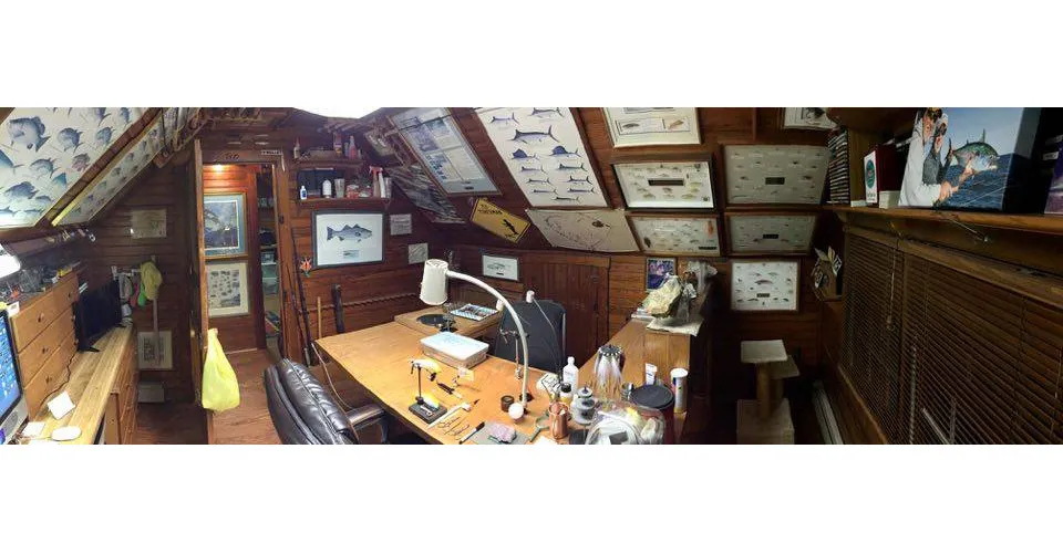 The birthplace of a lot of innovative fleye designs. Bob writes "Tying room is designed to hold my tools, hooks, eyes, TUFFLEYE, and LIMITED materials. I use a small box to hold materials I will need to do certain type FLEYE. You can see it on the table. Keeps a mess to a minimum. Some BUCKTAILS, feathers and flash are located in large drawers along the wall. Computer, tv and video equipment along wall also. Storeroom holds all the bulk of materials. Fishing equipment, bags, luggage, etc. coffee machine, little fridge (not in room yet), lots of books. BTW, forgot to mention rods along the ceiling and in slots along a wall and in hidden cubby holes."