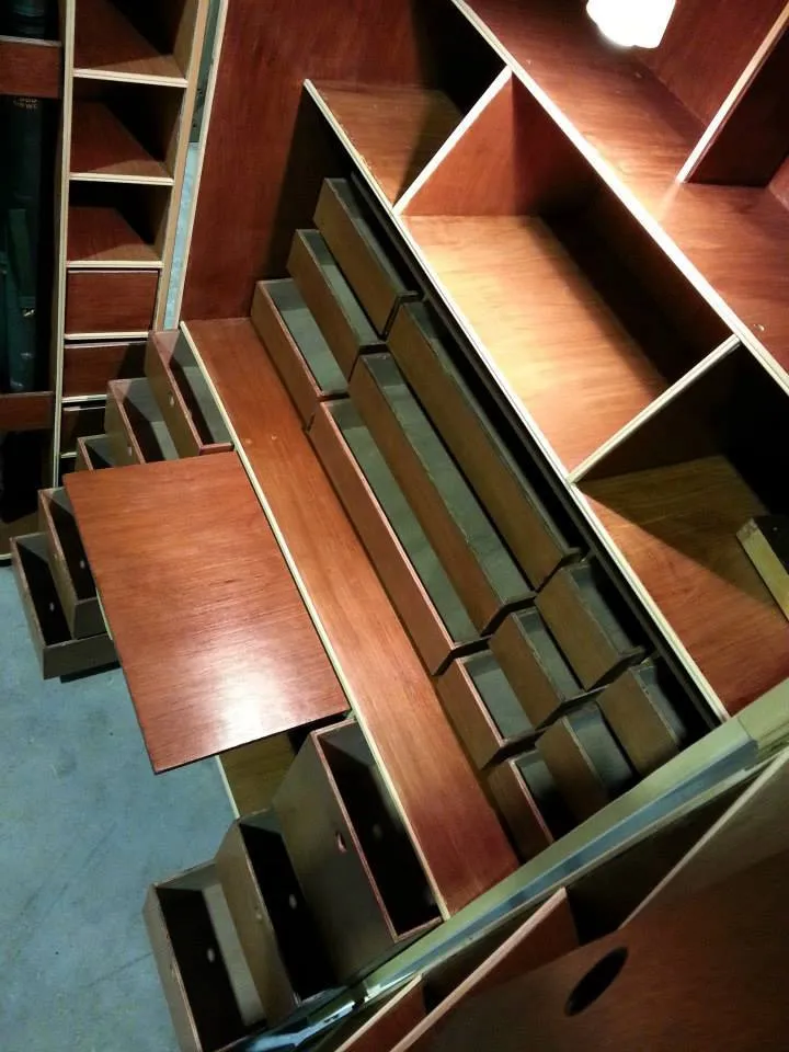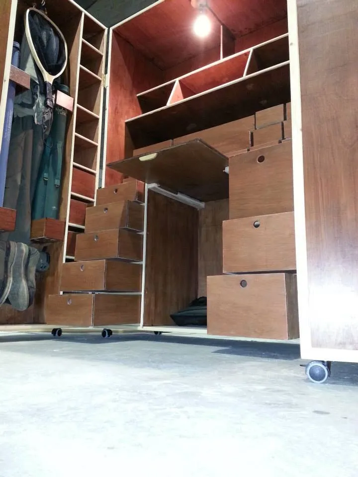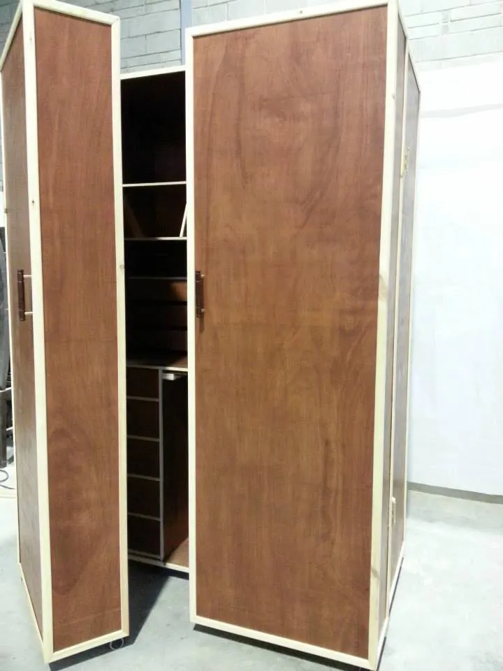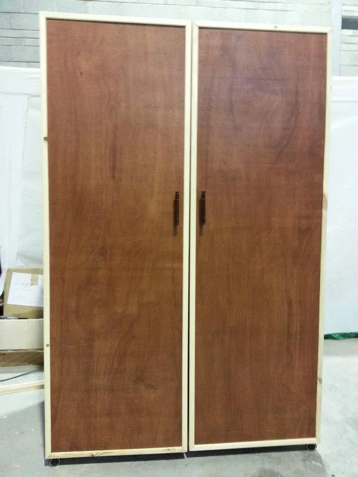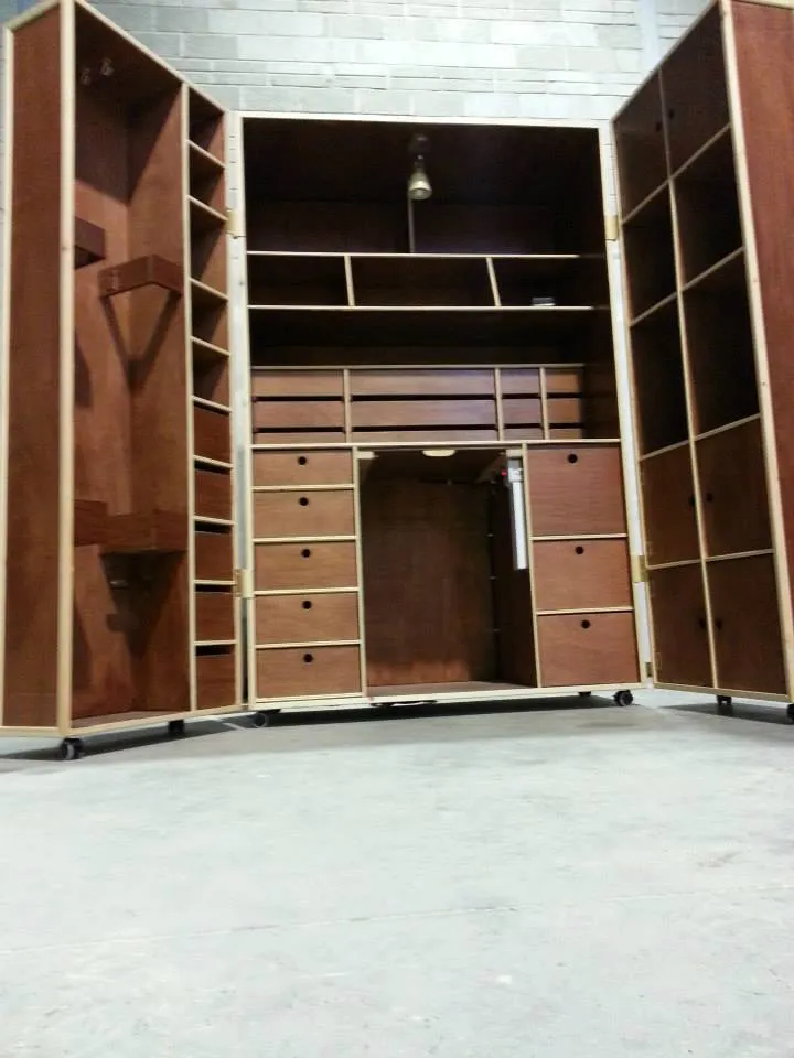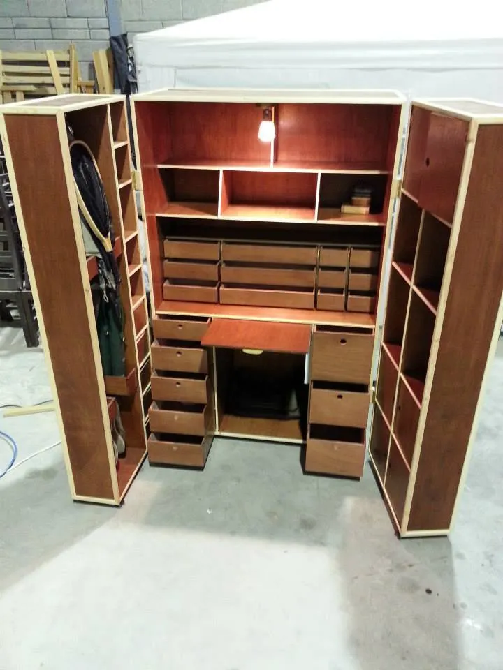 Basic Idea was to have a separate room for fly tying even if there isn't a separate room available in the house. The dimensions are width 110cm, depth 70cm and high 175cm ... with doors fully open it has a width of 220cm. I designed this one while I was building it ... so it took me a couple of weeks ... I guess I could make a copy of it working 70 hours (most time is down to sanding ... again and again)