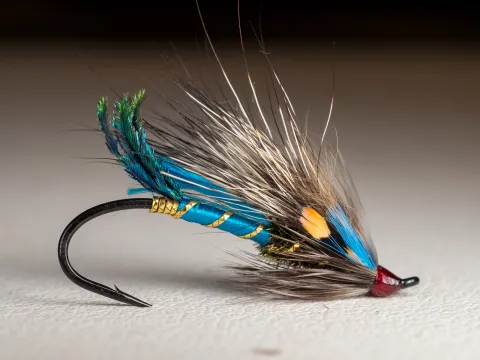 | Body | Rear Half Blue Floss, Veiled on top w/ blue floss extending to mid tail, front half peacock herl |