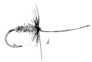 I turn the hackle, tie it down and wind the thread through the wound hackle and finish with a couple of half-hitches in front of the hackle. This last procedure can be something of a problem, when we as the custom is to-day have our thread on a bobbin-holder.
