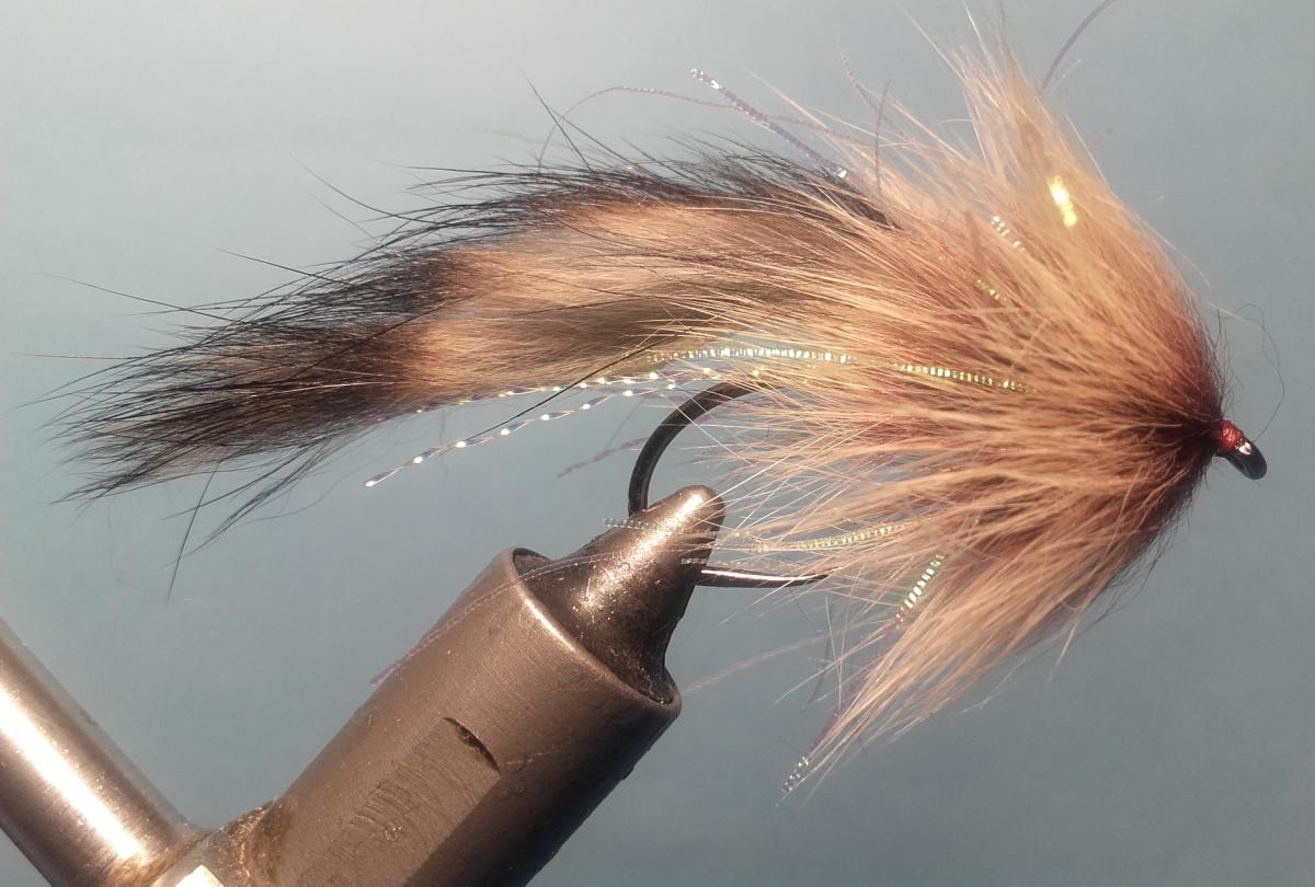 A bunch of rigid Crystal Flash will serve as a support for a zonker strip. The fur is rabbit, chestnut brown with some darker tips. Any color can be used, but this hue suits the pattern very well, and makes it live up to its name.