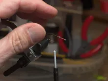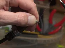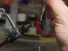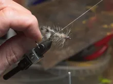 If you want to paint the eyes, do it before you tie any hair or feathers on the fly. Simply tie the eyes on the hook, whip finish, cover with nail polish and let dry. Prepare a bunch, and when they are dry, tie on the rest of the materials. Magnus Ting Mortensen ties his eyes under the hook shank, but the fly is seen with the eyes on top of the hook just as often.