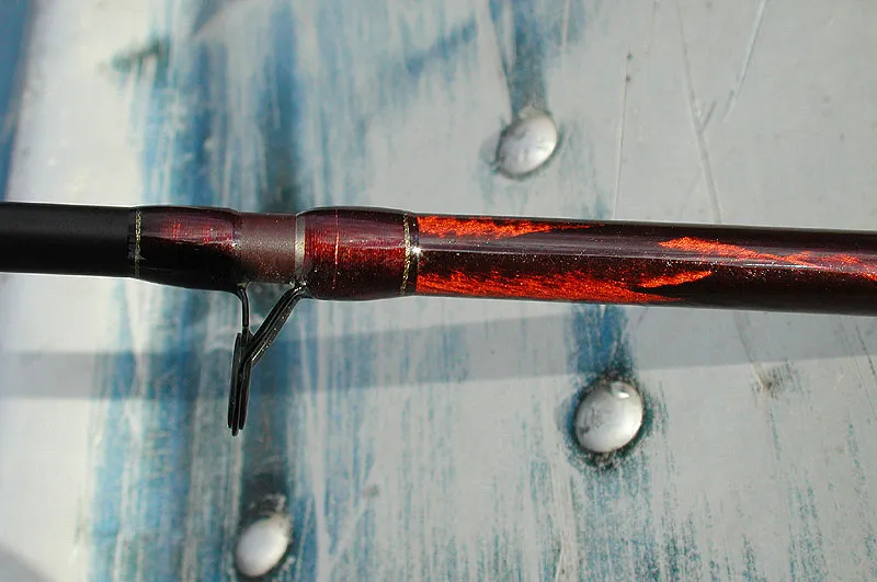 The butt of this rod is reinforced with an additional cross-wrapped 'sleeve' so to say, for additional oomph and lifting power. The contrast between the matte burgundy blank and the glossy cross-wrapped butt makes for a nice visual touch. Oh, by the way, the jonboat ain't mine; I use a Mad River Canoe...