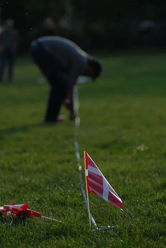 We poked small Danish flags into the ground to mark the different distances along the tape
