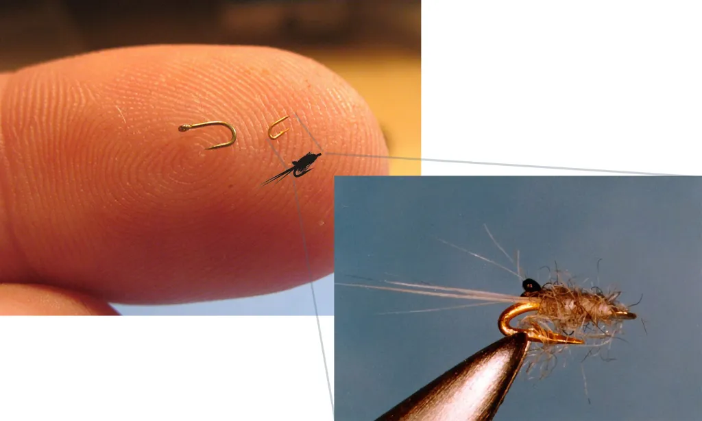 The shrimp fly is tied on the latter, and is silhouetted on the finger to try to illustrate its actual size.
