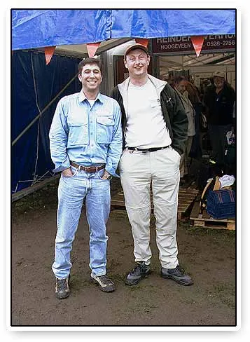 Two happy boys in front of the Fly Fair tent. American Rick Ross and Welsh Paul Slaney will not have to crawl under the canvas - they both appeared as tyers in the show.