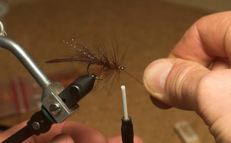 Tie down the rib in the front of the body. Trim the copper wire and the hackle tip