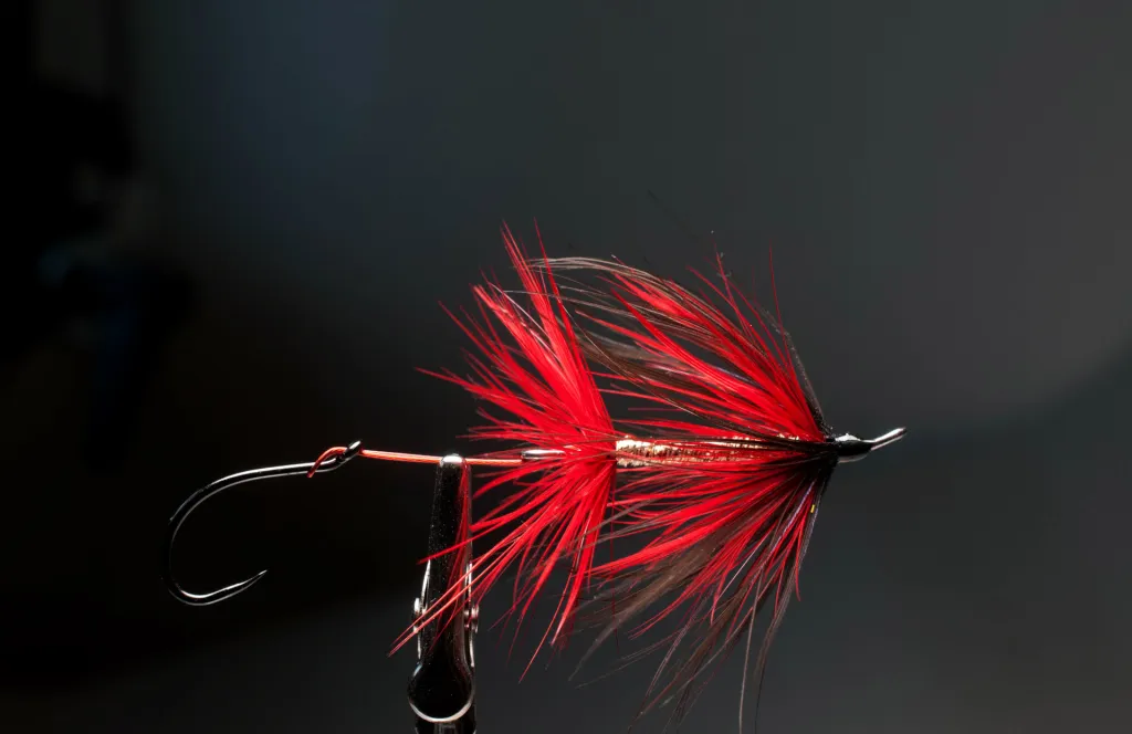 The Danish fly the idiot is usually tied on a hook, featuring a red tail and a black/red front hackle. Here it's tied as an intruder.
