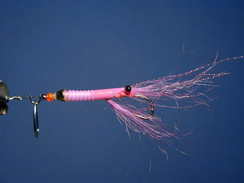 Bob writes: Every once in a while you hit the perfect storm and for me it was this fly (lure?). It's one of a very few flies of mine that Yuri Shumakov would use in Kamchatka (the other being Linda's Shrimp). It was so successful Yuri's only problem others would steal them, now its a big hit in Alaska, also some brave Scots are using it in red, black and orange. And yes, that's a straw in there... and a spinner blade in the front...