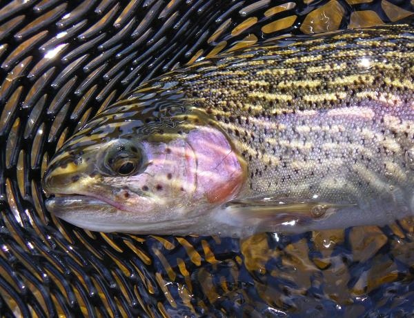 Sunlight dances across the flanks of a big Colorado River rainbow moments before release.