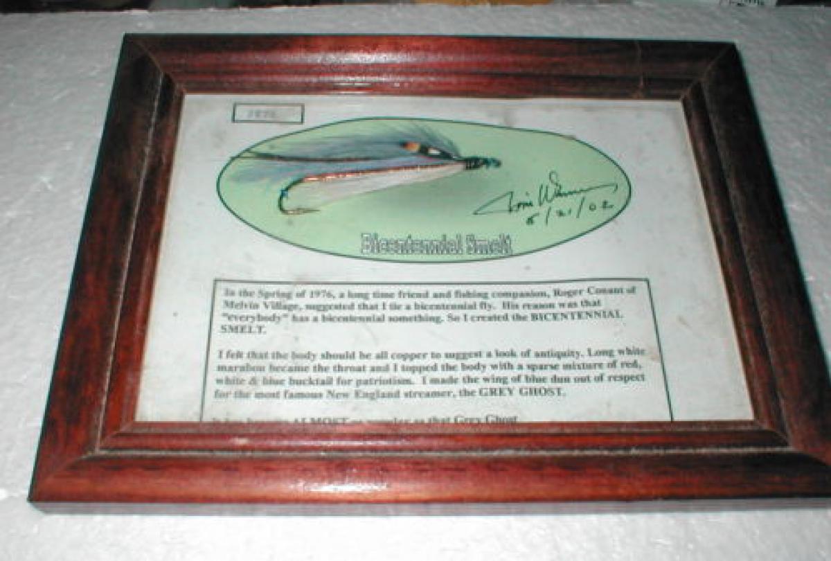 The Bicentennial Smelt was created in 1976, to commemorate the Bicentennial of the United States. This pattern has a copper body for antiquity, a traditional white marabou belly with an under wing of red, white and blue bucktail and the traditional Gray Ghost wing. A truely beautiful pattern.